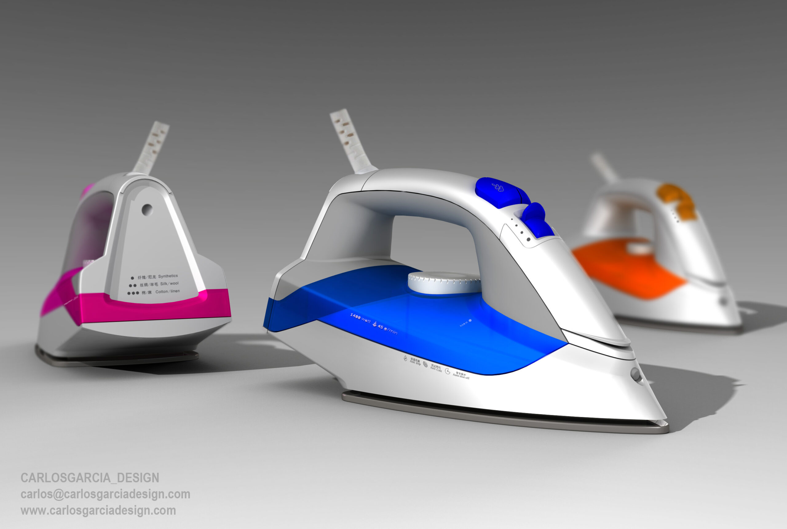 KIWI es una empresa especializada en pequeño electrodoméstico con su sede en Turquía que ha seleccionado para su catálogo de productos de cuidado de la ropa varias planchas creadas por CARLOSGARCIA_DESIGN. El diseño de estas planchas bajas de gama requiere de imaginación para, con pocos recursos de fabricación para poder mantener los costes a raya, conseguir hacerlas atractivas, para ello se hace un buen uso de los colores y acabados, es decir realizar un buen diseño CMF, en el que se piensa desde el inicio del proyecto desde sus primeros bocetos.